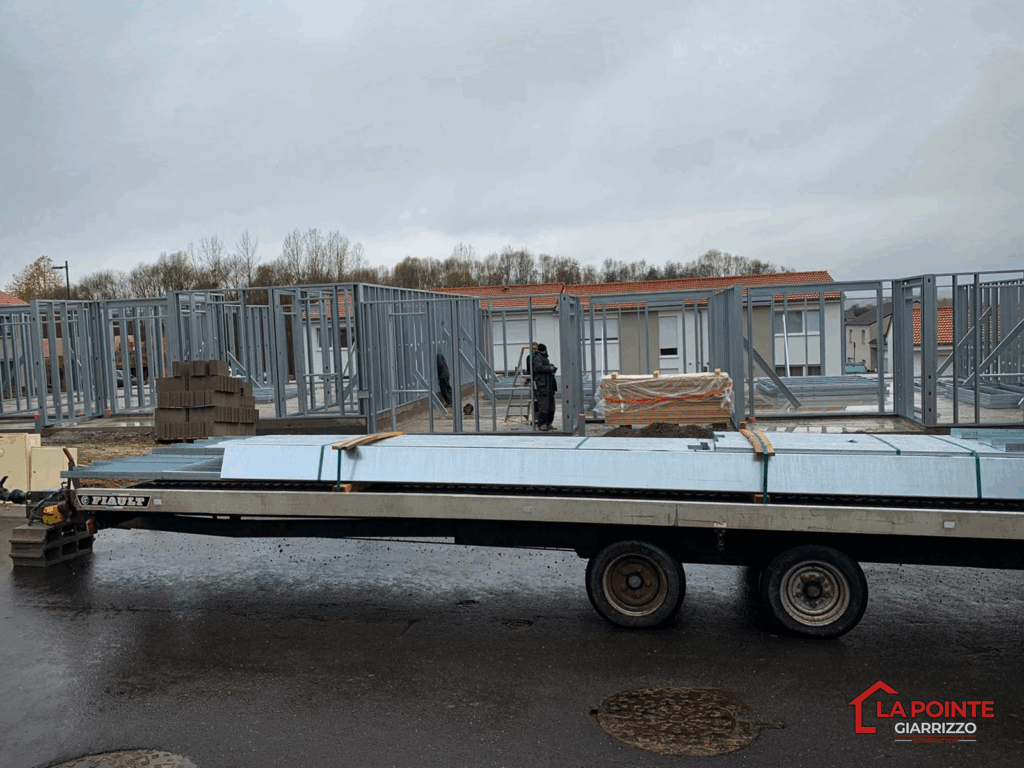 L'ossature métallique complète est érigée, le second niveau est en cours de montage, et les murs sont partiellement recouverts de panneaux de bois (OSB), assurant la stabilité et une première protection contre les intempéries.